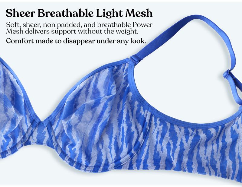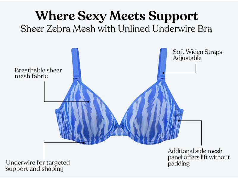 Introducing: Zebra Wild Unlined Underwire Mesh Bra! This striking bra combines the best of style and comfort, featuring a bold zebra print that adds a touch of wild sophistication to your lingerie collection. The unlined design provides a natural shape and feel, while the underwire offers excellent support. Crafted with high-quality mesh fabric, this bra ensures breathability and all-day comfort. It's the perfect choice for those who want to express their unique style while enjoying the confidence and comfort that only our bras can provide.